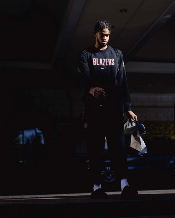 > 杨瀚森背着粉色小书包 利拉德&阿夫迪亚黑框眼镜 开拓者今日OOTD